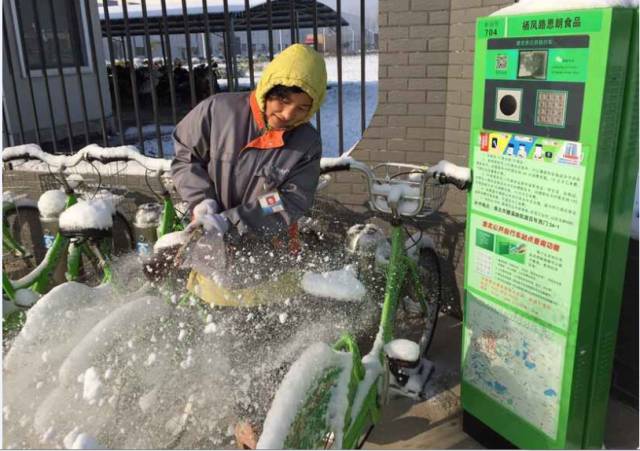 也許您從未注意過與我們擦肩而過的她們,但一定享受過干干凈凈的“小綠”給你們帶來的便利。她們騎著電瓶車,穿梭于每個大街小巷,仔細地檢查每一輛自行車。看見了嗎?她們手里的螺絲刀和抹布便是“魔法棒”,在降雪下雨時,總會仔細反復(fù)地擦除自行車上的積雪和泥濘,雖弄得滿身泥水,但能看到市民騎著干凈如新的自行車,她們便是溫暖的。
