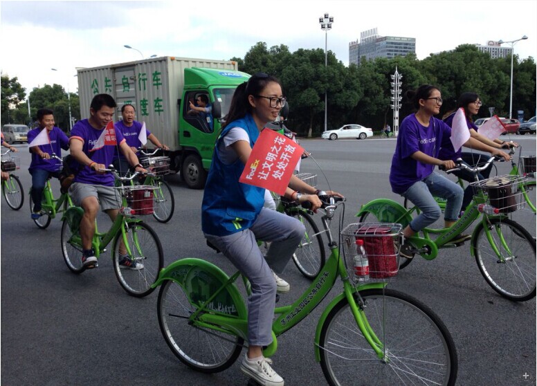 這次活動(dòng)準(zhǔn)備了30輛綠色自行車,掛上環(huán)保旗幟。沿著園區(qū)的主干道進(jìn)行了1~2小時(shí)的騎行。騎行隊(duì)伍分為兩支,一支主要圍繞湖西商業(yè)中心進(jìn)行騎行,一支圍繞湖東圓融廣場(chǎng)騎行。沿路向環(huán)衛(wèi)工人等戶外工作人員發(fā)放愛(ài)心禮品。