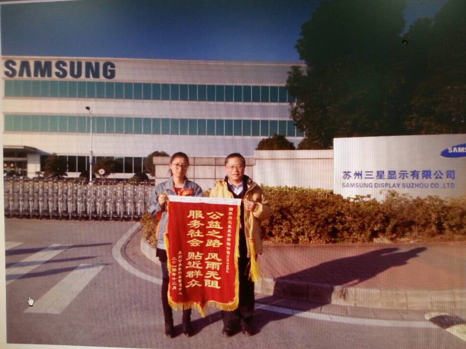 2014年12月22日下午,公司領(lǐng)導(dǎo)為三星液晶顯示器的工作人員贈送錦旗。對他們?yōu)楣沧孕熊嚬芾砉ぷ鞯闹С直硎靖兄x。幾年來,風(fēng)雨無阻堅持為自行車做保潔。讓美麗的蘇城更增添了靚麗的風(fēng)景線。