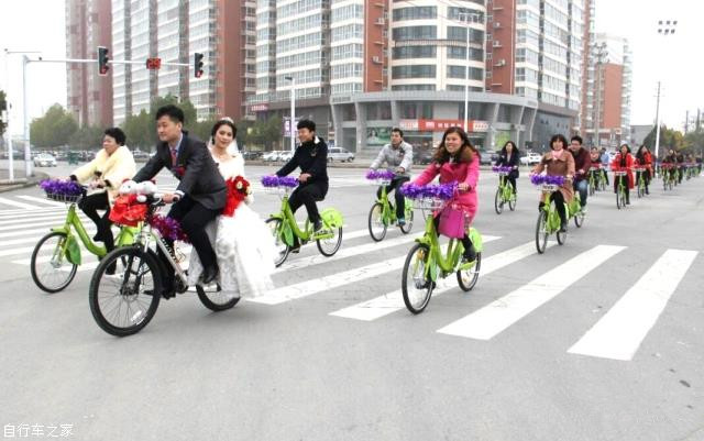 用公共自行車代替?zhèn)鹘y(tǒng)婚車,沒有豪車,沒有奢華的場面,但親友團(tuán)們組成的自行車陣,也賺足了市民的眼球,贏得百分百的回頭率。在高檔婚車“熱”的當(dāng)下,低碳、環(huán)保的公共自行車迎親隊(duì)伍猶如雨后一抹新綠,讓人眼前一亮。這種浪漫的結(jié)婚方式讓婚禮變得更有意義。