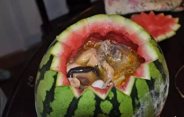 西瓜雞曾在蘇州當(dāng)?shù)爻掷m(xù)風(fēng)靡四五十年,因著只能在夏天吃,且必須當(dāng)天烹煮當(dāng)天吃,不能貯存又無(wú)法攜帶,因此知道的人還真不那么多。西瓜與母雞共蒸,瓜的清香滲入雞肉,雞肉又能保持原有的鮮嫩,考究點(diǎn)的店家還會(huì)在西瓜皮上雕圖刻畫,極富美味與觀賞性。