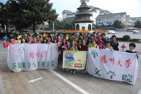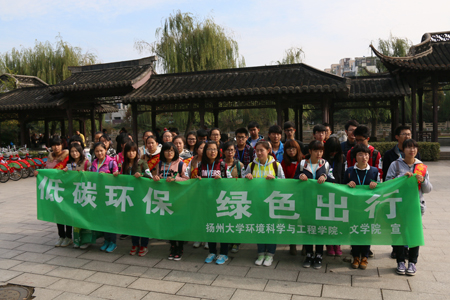 為宣傳“低碳環(huán)保,綠色出行”的理念,獻禮揚州建城2500年,11月9日上午,揚州大學環(huán)境學院與文學院的同學們以“把綠色奉為夢想,把夢想視為行動”為宗旨,發(fā)起了一場“綠色揚州行”活動。同學們踏起揚州公共自行車,騎行揚州城,向市民發(fā)出倡議——“將低碳生活進行到底?!?/p>