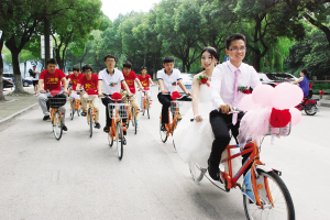 “我父母都覺得用汽車好,擔心公共自行車太寒酸?!毙”R的父母想給兒子一個體面的婚禮,打算借幾輛寶馬,一排寶馬開出去,覺得很氣派。但小盧覺得還是公共自行車好,環(huán)保、低碳又浪漫,關(guān)鍵這樣的婚禮在吳江還是首次,肯定很難忘。