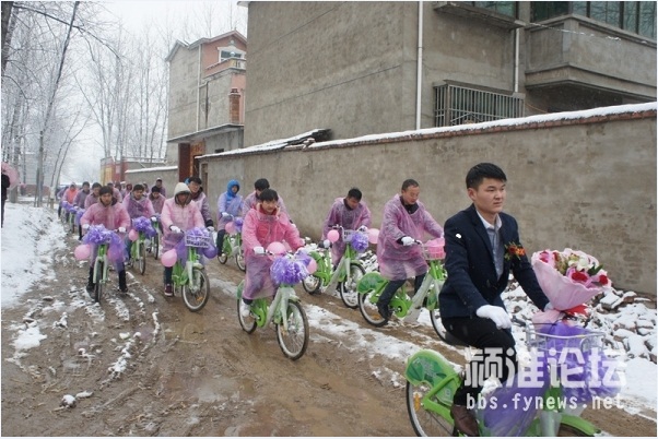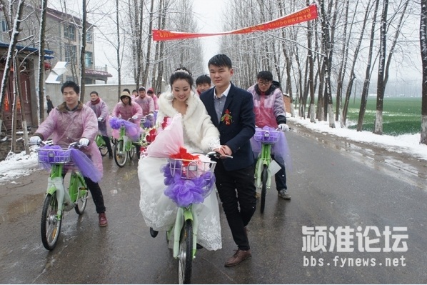 30輛公共自行車整齊碼開,時云濤“打頭陣”騎在最前面,后面時云濤的親朋好友們,四人一排,整齊劃一。因為一直在下大雪,新郎的家人還特別貼心的為騎自行車的人們準備了防寒的手套和粉色的雨衣,穿著小粉,騎著小綠,浩浩蕩蕩去新娘家迎親去,一支騎著公共自行車的婚車隊伍“招搖過街”也是賺足了回頭率,有不少路人駐足觀看,沿街接受路人的祝福,再配上這漫天大雪,簡直太浪漫了。新娘閆瑞金告訴記者:“時云濤平時在生活中就是一個非常浪漫的人,兩人在談戀愛時就經(jīng)常會想出許多有創(chuàng)意的點子我開心,這次用公共自行車來迎親也是讓我非常意外,而且也非常有紀念意義,我相信這個婚禮會讓我終身難忘。外面一直在下雪,我也非常感動,他也和迎親隊伍一路騎車過來,相信我們以后一定會幸福到永遠?!?/p>