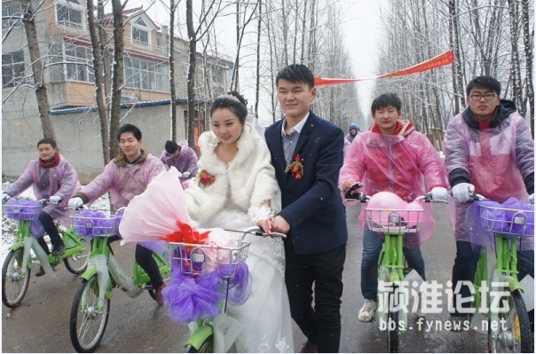 時云濤是一名年輕的90后,在阜陽臨沂商城從事門業(yè)生意。新娘名叫閆瑞金,是行流鎮(zhèn)高橋村人,新娘和新郎是高中同學,兩人戀愛至今已經(jīng)走過了四五個年頭,大學期間兩人分隔兩地,新郎時云濤在大一時退學回家創(chuàng)業(yè),自主創(chuàng)業(yè)生意也是越來越紅火,事業(yè)有成接下來就要抱得美人歸了,結(jié)婚無疑是一件人生大事,這結(jié)婚就是要結(jié)的與眾不同,什么樣的結(jié)婚形式才能更別出心裁呢,時云濤在采辦結(jié)婚用品的時候,碰巧看見了停放在臨沂商城附近的公共自行車,時云濤就想如果用公共自行車當婚車,不僅節(jié)能環(huán)保,而且整齊劃一,想想那齊刷刷排整齊的自行車迎親隊伍,效果應(yīng)該是不一般的吸引眼球吧,于是這個創(chuàng)意婚禮的念頭就這樣應(yīng)運而生。