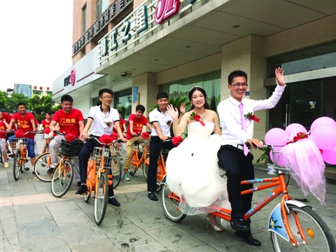 □商報(bào)記者 崔陽陽 文/攝 在蘇州,結(jié)婚車隊(duì)不乏開著寶馬奔馳,抑或更為豪華奢侈的進(jìn)口大牌車??勺蛱?,吳江區(qū)的一對(duì)小夫妻,卻選擇了另一種新奇浪漫的方式,公共自行車成了新郎迎娶新娘的另類座駕。盧云龍,剛大學(xué)畢業(yè)的一伙子,用他的汗水和誠意娶上了心目中最美的媳婦。 吳江區(qū)江陵西路的一小區(qū)里,鞭炮、禮杖聲聲入耳,有個(gè)小子要娶媳婦,竟然用的是公共自行車!這個(gè)消息傳遍了整個(gè)小區(qū)。20輛公共自行車整整齊齊地排列在盧云龍家樓下,每輛自行車的車頭還掛著喜氣的紅花,其中最醒目的雙人自行車正是盧云龍迎娶新娘鄭丹的牛氣座駕,粉色的氣球組合在車頭迎風(fēng)飄逸。一大早,吳江區(qū)公共自行車管理中心的工作人員就已經(jīng)把這20輛自行車送到了盧云龍家樓下。工作人員告訴記者,新郎是通過12345市民熱線聯(lián)系到他們的,當(dāng)?shù)弥孕熊囀怯糜诮Y(jié)婚車隊(duì)時(shí),中心決定免費(fèi)為新郎提供,還專門送到家。“這也是低碳環(huán)保的一種方式,我們當(dāng)然會(huì)支持?!惫ぷ魅藛T說。 盧云龍騎著雙人自行車,帶著他的那幫哥們姐們,在酒店迎娶到了他心愛的姑娘鄭丹。“我老婆是山東淄博人,所以迎娶前就把她安排在酒店里。”天氣的炎熱讓盧云龍滿頭大汗,卻掩藏不住他娶媳婦的興奮,被抱上車的新娘鄭丹也是笑靨如花。中山北路、江興西路、西塘河路、江陵西路,自行車迎親隊(duì)一路洋洋灑灑,振臂高呼“新婚快樂”,引起了不少路人的注意。家住嘉鴻花園的畢先生告訴記者,“今天周末起了個(gè)早,沒想到看到用自行車結(jié)婚的新鮮事,現(xiàn)在年輕人了不得?!睋?jù)了解,這次騎自行車結(jié)婚的策劃幾乎都是新郎一人全程策劃。大到和城管聯(lián)系借到公共自行車,小到上淘寶買紅色“搶親”t恤,都是盧云龍一手操辦。“寶馬奔馳的車隊(duì)太多了,我和她想有個(gè)不一樣的記憶,組個(gè)自行車隊(duì)迎娶不僅低碳環(huán)保,也重溫了一把大學(xué)時(shí)光,我倆都覺得很浪漫?!毙吕杀R云龍開朗而熱情。盧云龍和他的新娘鄭丹都是青島農(nóng)業(yè)大學(xué)的大四畢業(yè)生,小夫妻兩人在大一的時(shí)候就相識(shí)了?!澳鞘且淮紊瞎_課,我去得晚,也找不到其他座位,就坐到了她的身邊,就這樣聊了起來?!睕]想到一聊就聊成了一對(duì)眷侶,兩人到大一期末時(shí)就正式走到了一塊。接下來的三年時(shí)光,兩人最美好的回憶,莫過于兩人各騎一輛車去學(xué)校后面的山上玩?!澳蔷褪俏覀兊募s會(huì)。山上有許多果園,我倆一路騎行到山上,付給果農(nóng)50元,里面的蘋果、梨子、櫻桃,有啥都可以摘著吃,每次都盡興而歸。”盧云龍愉快地回憶著。 今年6月兩人同時(shí)從大學(xué)順利畢業(yè),看著周圍的朋友不少畢業(yè)就分道揚(yáng)鑣,相愛的兩人決心給三年的愛一個(gè)完滿的結(jié)局,他們選擇了一畢業(yè)就結(jié)婚。“我們愛對(duì)方,各方面的條件也成熟,何苦拖時(shí)間為難自己?”盧云龍對(duì)自己的“畢婚”做這樣的解釋?! ?duì)于騎個(gè)自行車就把新娘娶回家的建議,最先提出的是他的妻子鄭丹。那時(shí)新人雙方家長在一起商量車隊(duì)的事,是選用幾萬元的寶馬車隊(duì),還是選擇自家親戚組建車隊(duì),一直爭(zhēng)執(zhí)不下。這時(shí)候新娘鄭丹提了出來,“那干脆用自行車吧?!边@個(gè)建議剛拋出就遭到了父母的反對(duì),“一生難得結(jié)次婚,不用輛好車說不過去,大人們都這么想?!辈贿^最后在小夫妻倆的堅(jiān)持下,父母終于想通了,還得到了家里不少親戚的支持?!斑@小奔子,思想很有創(chuàng)意,以前我們結(jié)婚的時(shí)候是用自行車的,現(xiàn)在他們年輕人又開始流行了,還說寶馬奔馳啥的太土。”盧云龍的舅舅告訴記者,“小奔子”正是盧云龍的小名。(責(zé)編:呂琳)